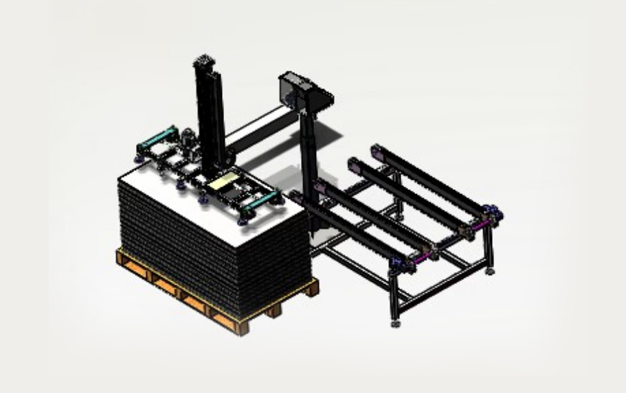 自動排版機(jī)的主要功能單元有:玻璃輸送定位系統(tǒng)、抓取行走系統(tǒng)、視覺檢測系統(tǒng)、電控系統(tǒng)等;通過以上功能單元,實現(xiàn)了將自動串焊機(jī)串焊好的電池串,按照工藝尺寸要求和排版方向順序自動排版鋪設(shè)到玻璃(EVA已經(jīng)鋪設(shè))上,組成電池串陣列。玻璃/EVA通過傳輸線傳輸至指定位置,機(jī)械手抓取電池串實現(xiàn)CCD定位、自動旋轉(zhuǎn)、自動排版功能。設(shè)備通過同步帶傳輸與自動生產(chǎn)線對接,實現(xiàn)了自動流水作業(yè)。
